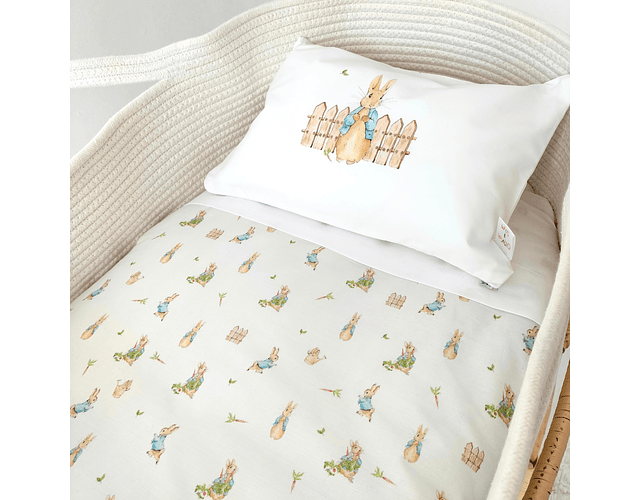 Moisés o Cesta de algodón color beige claro con asas , colchón de espuma ovalado de 4 cm de espesor , sabana bajera ovalada elásticada blanca , sabana encimera blanca , funda de almohada reversible con diseño por ambos lados + almohadita rellena con algodón hipoalergénico , Cobertor acolchado reversible con diseño Peter Rabbit por un lado y reverso con lineas color beige .